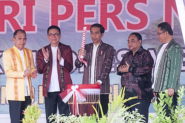For free but responsible press: President Joko “Jokowi” Widodo (center) strikes a tifa, a traditional Maluku drum, during the opening of the National Press Day celebrations in Ambon, Maluku, on Feb. 9, 2018. Indonesian Journalists Association (PWI) chairman Margiono (second right), Indonesian Press Council chairman Yoseph Adhi Prasetyo (second left), Communications and Information Minister Rudiantara (right) and Maluku governor Said Assagaff were also present.